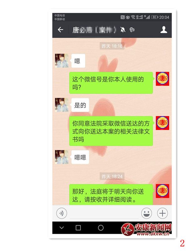 安康新聞網(wǎng)訊(通訊員 翁雪)微信送達(dá)訴訟文書,成為新形勢(shì)下加強(qiáng)人民法院與當(dāng)事人之間溝通交流、化解糾紛的一種快捷便利手段,大大節(jié)省了訴訟成本和時(shí)間,這是紫陽(yáng)法院在訴訟文書送達(dá)方面靈活、務(wù)實(shí)、高效的又一探索。承辦法官只需手指輕點(diǎn),即向案件當(dāng)事人發(fā)出“微信傳票”,不到十秒時(shí)間,對(duì)方立即回復(fù):“收到。”這就是紫陽(yáng)法院第五審判團(tuán)隊(duì)向唐某與楊某離婚案件當(dāng)事人成功送達(dá)開庭傳票的情景。