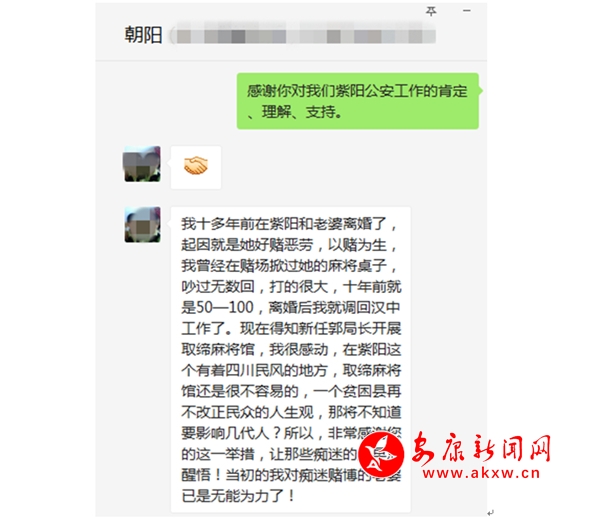 8月7日8時25分,紫陽縣公安局新媒體中心接到電話號碼為1589166****的漢中籍男士打來的電話,在電話里,該男士非常激動的對紫陽縣公安局作出的開展貧困村麻將館、棋牌室集中整治專項行動贊不絕口,該男士在電話里訴說:“我是漢中人,有正式工作,也是紫陽女婿,多年前和媳婦一起住在紫陽,紫陽是個好地方,但是,就是賭博之風太嚴重了,媳婦一度沉迷賭博,屢次勸說不聽,一場牌局下來,少則輸幾千,多則輸幾萬,幾年下來,殷實的家庭四處舉債,一度舉步維艱,迫不得已,和媳婦離了婚,傷心之余,將工作調回了漢中。前幾天,在網(wǎng)上看到了紫陽縣公安局發(fā)出的禁賭通告,覺得非常好,要脫貧,就要先禁賭,特別感謝郭書記!這次禁賭行動,是給那些喜好賭博的人敲響了警鐘,告誡那些沉迷賭博的人:應該把精力放在脫貧致富、建設美好家園上,沉迷賭博,害人害已。”5Mc安康新聞網(wǎng)