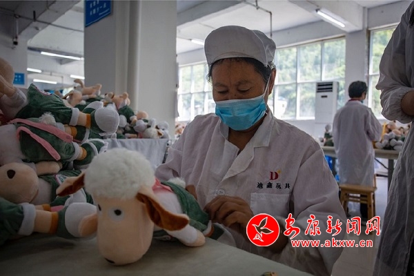 記者了解到,當地政府去年9月從江蘇省揚州市引進迪鑫玩具工廠,從事毛絨玩具生產加工,當年11月8日正式開工生產。形成了“1+9+X”生產加工體系。實現了當地300余名群眾就近就地就業增收。短短8個月時間,吸納當地剩余勞動力254人在總廠及村級車間穩定就業,其中貧困戶109人,占比42.9%;帶動不便離家人員50余人,足不出戶在家做工增收。