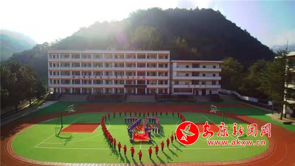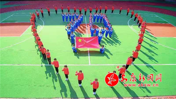 幾十名身穿藍(lán)色班服的學(xué)生在操場(chǎng)正中央排成數(shù)字“70",在數(shù)字正前面,四名同學(xué)展開國(guó)旗,然后,數(shù)十名身穿紅色班服的學(xué)生在外圍圍成"心"形。"70",象征著70周年,"心"型, 寓含著孩子們對(duì)偉大祖國(guó)的熱愛。整個(gè)造型寓意深刻,活動(dòng)表現(xiàn)形式新穎獨(dú)特,令人耳目一新。