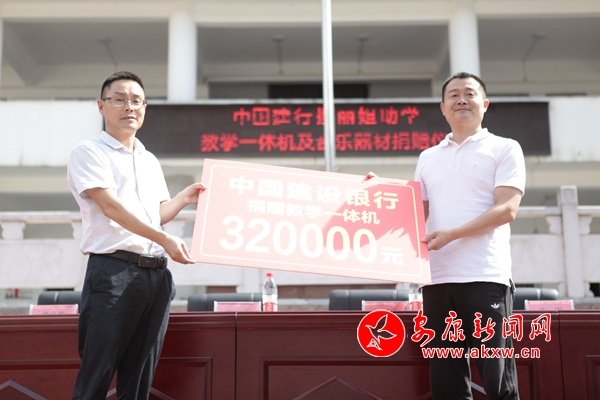 本網訊 (通訊員 劉成軍)金秋送爽,丹桂飄香。9月18日下午,由中國建行向紫陽縣高橋鎮初級中學捐贈的教學一體機及音樂教室設施設備的捐贈儀式在該校操場舉行,紫陽縣縣委常委、副縣長張雪峰出席捐贈儀式,麗姐助學負責人孫麗、鎮相關領導及高橋中學全體師生參與活動。