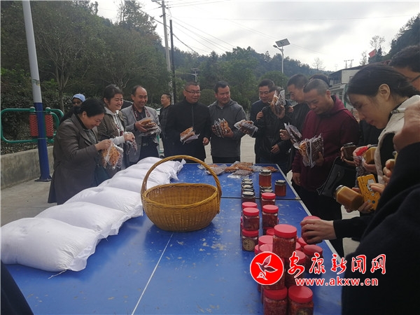 在黃金村駐村工作隊組織下,20戶貧困戶把自家生產加工的土特產品運到村中心廣場,廣場上堆放著苦蕎、土蜂蜜、土雞蛋、包谷酒、干蘿卜片、豆腐乳、黃豆醬和新鮮丹參等產品,幫扶干部踴躍購買,現場產品銷售一空;顒庸蹭N售了20戶貧困戶11種農副產品,銷售額達1.2萬余元。