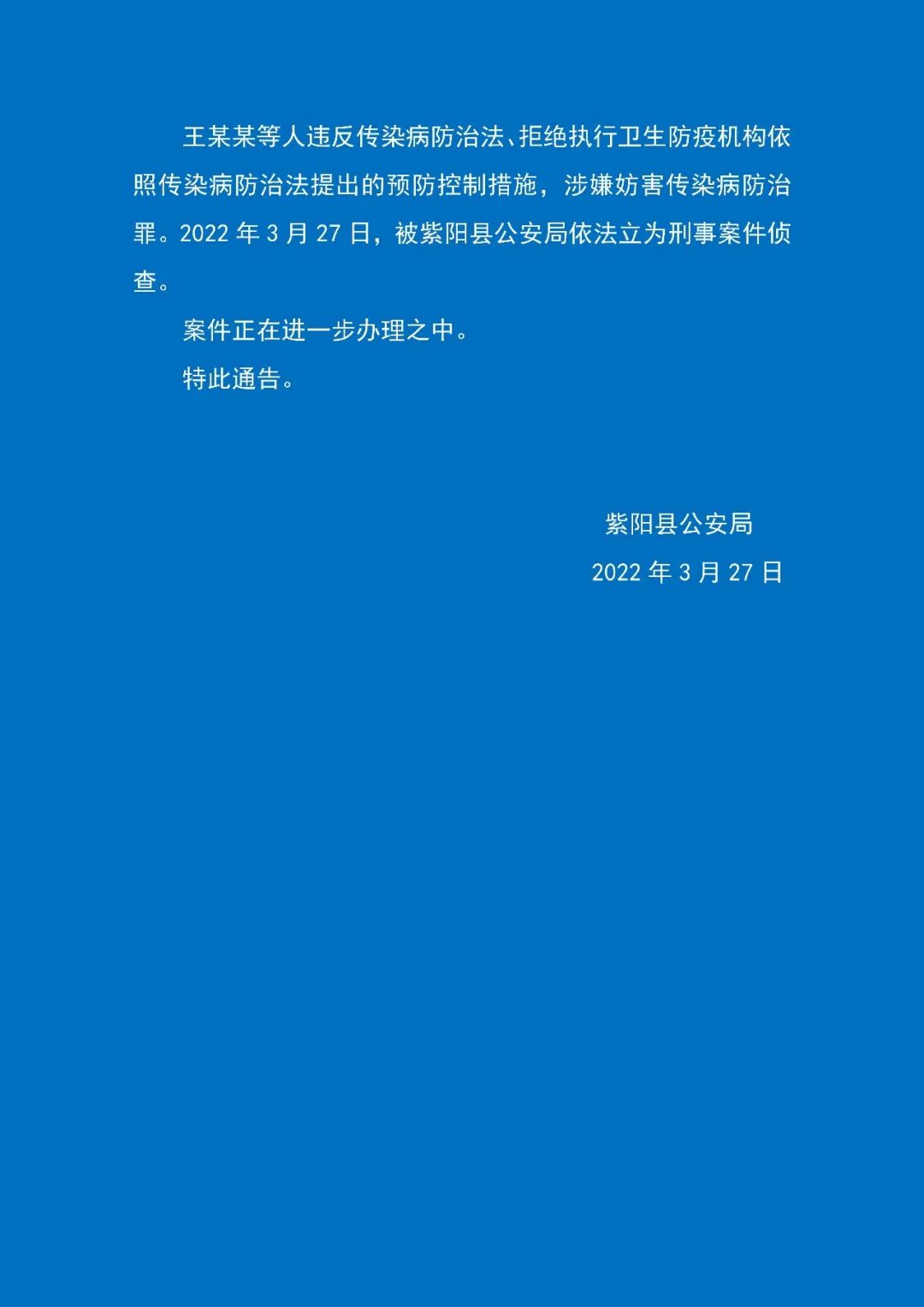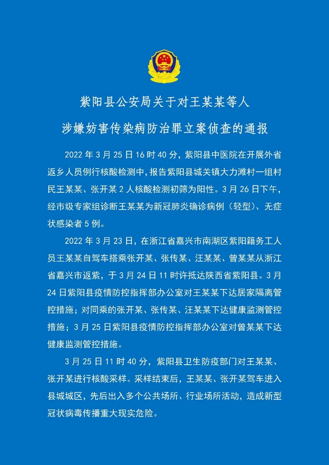 紫陽縣公安局關于對王某某等人涉嫌妨害傳染病防治罪立案偵查的通報