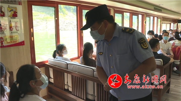 上午10點,學生們排著整齊的隊伍,戴著口罩、背著書包,陸續登船。紫陽縣交通運輸綜合執法大隊水運中隊中隊長楊超和其他工作人員、船舶安全員一起,分別站在船頭和岸邊,引導學生,保障安全。