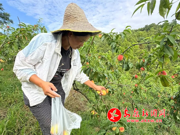 果園負(fù)責(zé)人胡小飛是王家河村的致富帶頭人,已種桃6年多。憑著成熟的種植和管理經(jīng)驗(yàn),他家的桃子色澤鮮艷、汁多肉厚、口感脆甜,深受游客們的青睞。“今年雨水少,桃子雖然個(gè)頭小,但味道特別甜”,楊秀榮穿梭在桃園里邊摘桃邊介紹道。