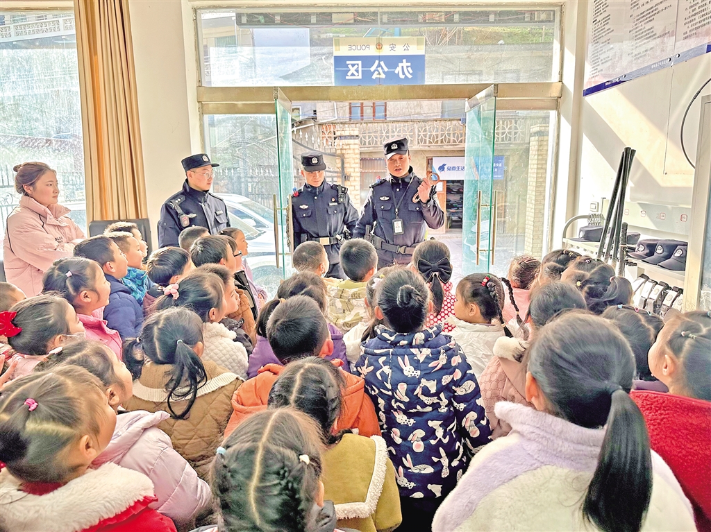 1月8日,紫陽縣公安局高橋派出所舉行“萌娃進(jìn)警營 警心伴童心”主題110宣傳日警營開放活動(dòng),邀請(qǐng)轄區(qū)學(xué)校師生走進(jìn)警營,感受警營文化。陳益謙 攝VVF安康新聞網(wǎng)