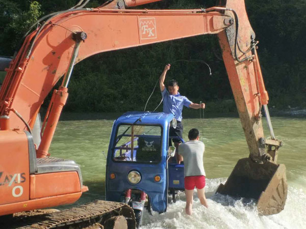 危急!男子騎車強行過河 漲水被困嚇傻