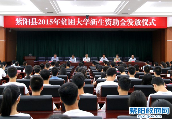 8月18日,紫陽縣委、縣政府舉行2015年貧困大學新生資助金發放儀式,為100名貧困大學新生現場發放了資助金,確保他們順利入學。縣長趙立根首先對考上大學的莘莘學……