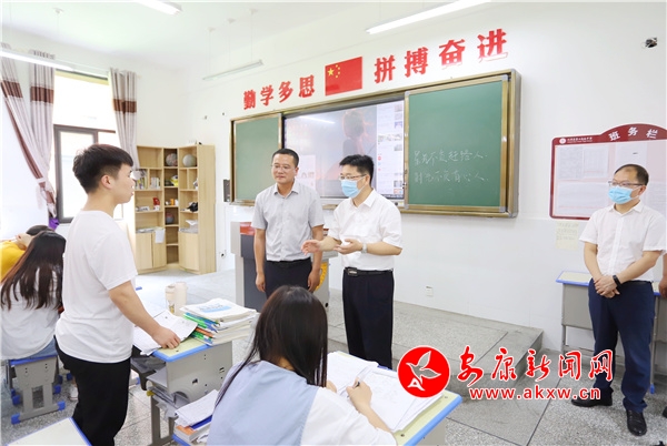 在漢濱高中, 寇全安一行先后檢查了入校檢測點、防疫物資儲備、監(jiān)控平臺運行等,了解考點參考人數、考場布置,以及食品安全、試卷保密等備考保障措施落實情況,叮囑要壓實各方責任,加強統(tǒng)籌配合,為廣大考生營造安全安靜、舒適舒心的考試環(huán)境。在江北高中和漢陰縣第二中學,他走進教室和高考學子交談,勉勵他們保持良好心態(tài),從容備考應考,并祝福考生取得優(yōu)異成績;還著重了解了學校心理咨詢室運行情況,并就如何開展心理健康教育和預防校園暴力與校長、部分教師進行了交流探討。