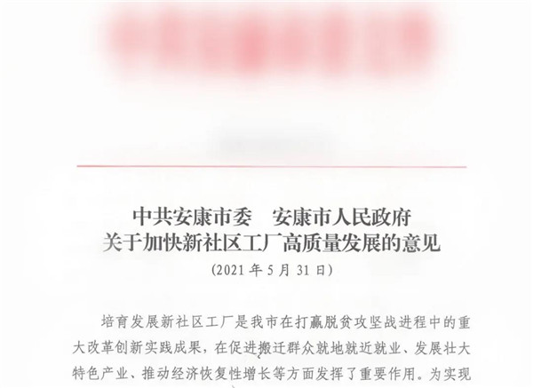 近年來,我曾多次強調發展新社區工廠的重要意義。在去年9月20日新社區工廠發展推進會上,我講了“新社區工廠是促進經濟恢復性增長和鞏固脫貧攻堅成果的最佳結合點”;在去年11月接受《民生周刊》記者專訪時,我講到“推動安康新社區工廠發展絕不是一件小事,而是關乎民生福祉和社會和諧的頭等大事”“現在是‘一把手’工程,今后也應該是‘一把手’工程”。