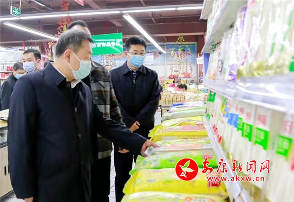 (市長武文罡在喜盈門超市南環路店實地查看米面等生活必需品供應情況)