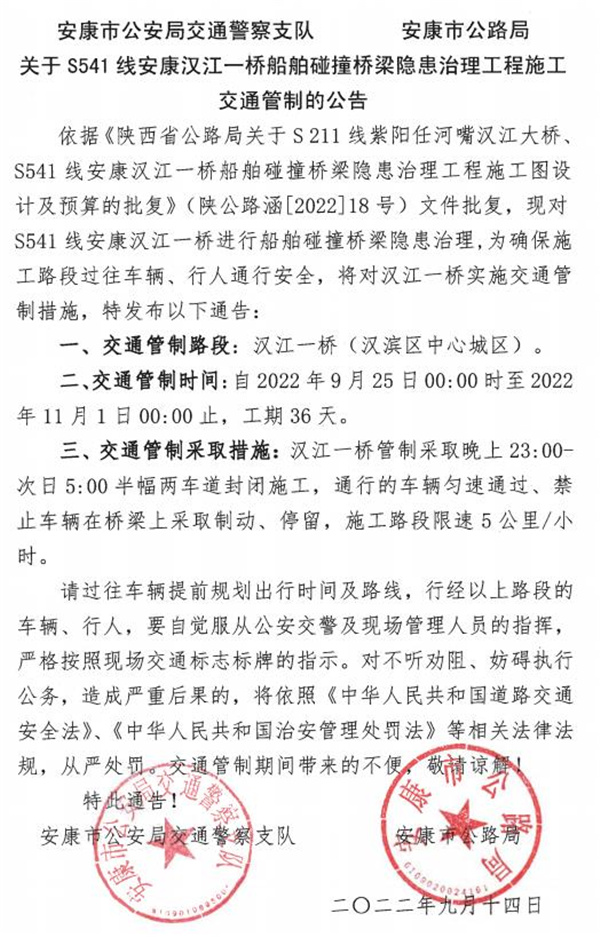 9月25日至11月1日安康漢江一橋將進行船舶碰撞橋梁隱患治理工程施工,將對漢江一橋實行交通管制36天,管制采取晚上23:00-次日5:00半幅兩車道封閉施工,通行的車輛勻速通過,禁止車輛在橋梁上采取制動、停留,施工路段限速5公里/小時。qmU安康新聞網