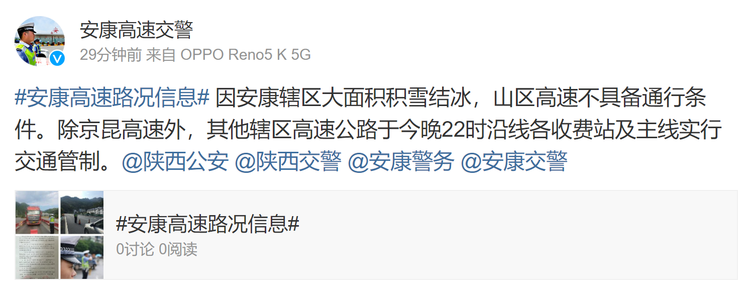 據(jù)安康高速交警消息:因安康轄區(qū)大面積積雪結(jié)冰,山區(qū)高速不具備通行條件。除京昆高速外,其他轄區(qū)高速公路于今晚(2月22日)10時(shí)沿線各收費(fèi)站及主線實(shí)行交通管制。 2sn安康新聞網(wǎng)