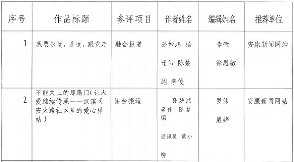 按照省記協要求,特將推薦參評2023年度陜西新聞獎融合報道初評的作品予以公示。公示期為2024年1月16日至1月22日,在此期間內如有異議請向新聞管理部反饋。報送作品如下: DAa安康新聞網