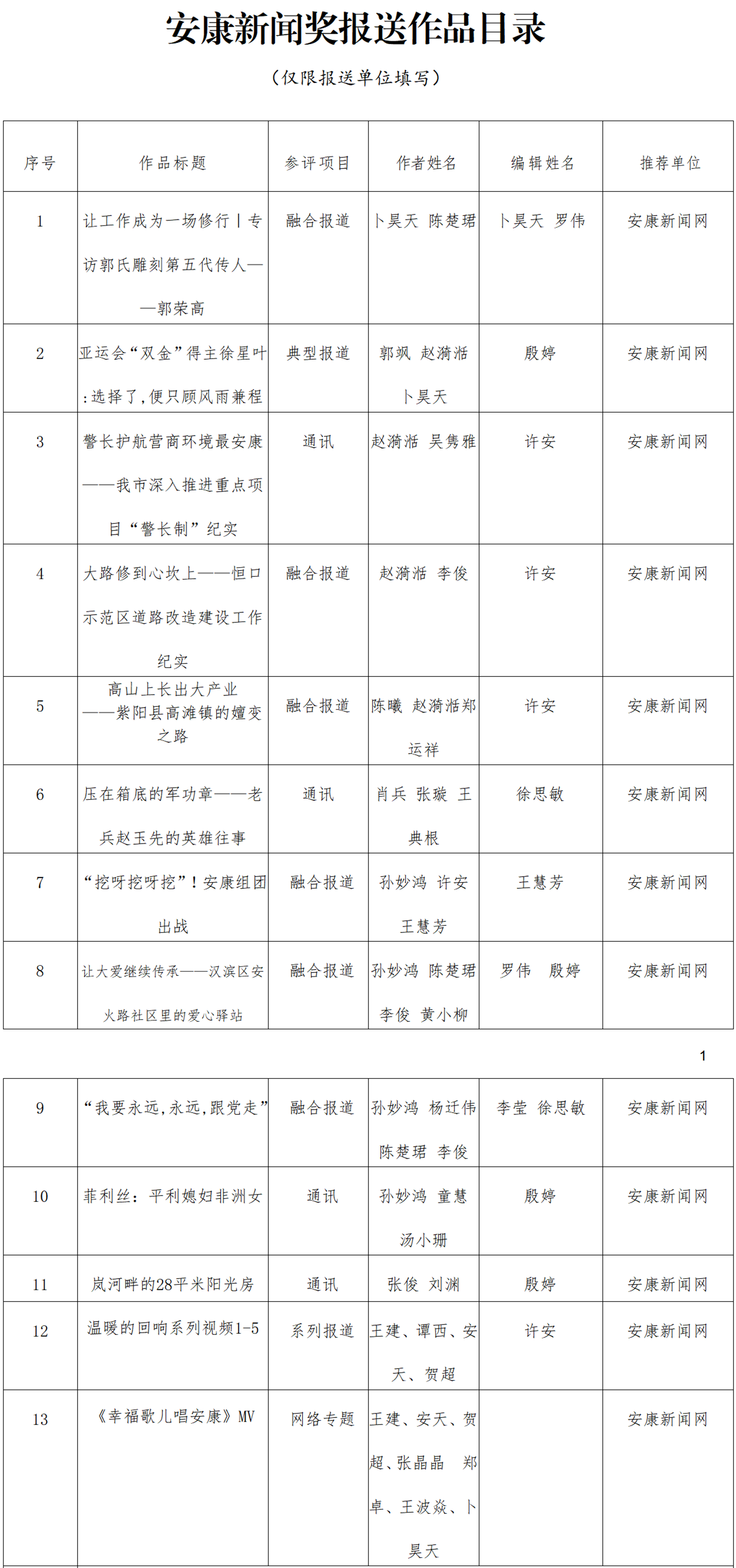 經(jīng)過編委會推薦、社黨委研究決定,擬推薦以下13件新聞作品參評2023年度“安康新聞獎”。公示時間從2024年3月25日至2024年3月29日,公示期為5個工作日。如有不同意見,請向安康日報社機關(guān)紀委、新聞管理部反映。nyB安康新聞網(wǎng)