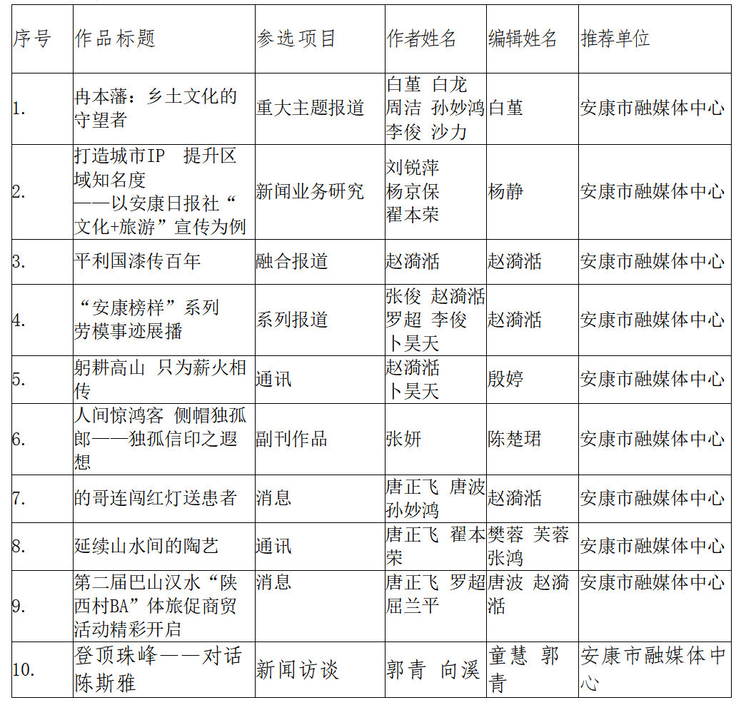 附件:安康優秀新聞作品報送目錄(補充)(共計10件)