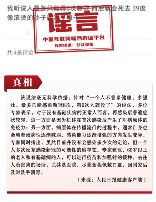 傳“偽科普”販賣焦慮引恐慌。5月以來,全國多地入夏,迎來炎熱高溫天氣,與季節關聯性較強的科普信息備受關注,“空調反復開關能省電”“夏天吃‘苦’勝似進補”等誤區信息也隨之被炒作、散布。特別是近來新冠“二陽”病例增多,“新冠抗體半年保護期”“新冠病毒新型變異株”等信息在網上引發熱議,給民眾心里平添“忐忑”。于是,有人借機搭蹭熱點,以“科普”之名捏造“一個人不管多健康,多強壯,最多只能感染新冠8次,第9次人就沒了……”等聳人聽聞的謠言,盡管有專家駁斥其“純屬無稽之談,毫無科學依據”,但仍在一定程度上激發了部分人群的恐慌情緒。