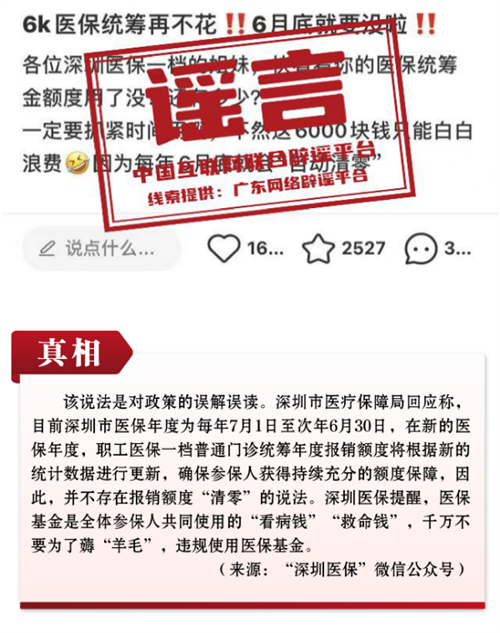 謠言6:深圳醫保統籌額度再不花,6月底就“清零”?
