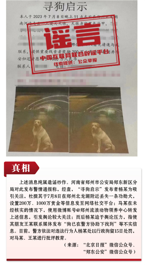 謠言9:鄭州有人懸賞1000萬(wàn)尋找丟失愛犬?