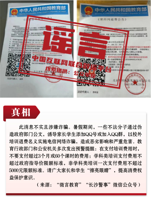 謠言2:教育部發(fā)文責(zé)令某校外培訓(xùn)機(jī)構(gòu)退費(fèi)?