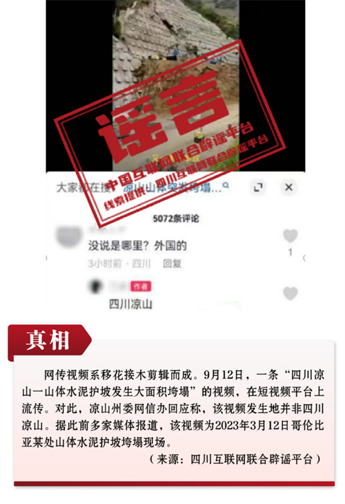 搭蹭熱點謊報災(zāi)情損公益。隨著備受矚目的杭州亞運會拉開帷幕,有商家搭蹭熱點借亞運會重要賽事活動博取關(guān)注,散布“快遞停發(fā)通知”謠言,意圖增加銷量牟取利益;受臺風“?”殘余環(huán)流影響,福建、廣東等地持續(xù)降雨導(dǎo)致洪澇災(zāi)害,網(wǎng)上隨之出現(xiàn)一些謠言,比如“深圳極端特大暴雨南山區(qū)停工一天”“深圳龍崗區(qū)龍河路有人被沖進河流”“深圳龍崗內(nèi)澇外賣員因漏電死亡”等謠言,或移花接木、或張冠李戴,干擾搶險救災(zāi)工作;還有人編造傳播“四川涼山一山體水泥護坡發(fā)生大面積垮塌”的短視頻,引發(fā)網(wǎng)民議論,但事實上該視頻是將南美洲哥倫比亞某處山體水泥護坡垮塌現(xiàn)場偷梁換柱而來,這種隨意剪輯視頻捏造假消息的行為,歪曲事實、挑動情緒,嚴重損害社會公益。