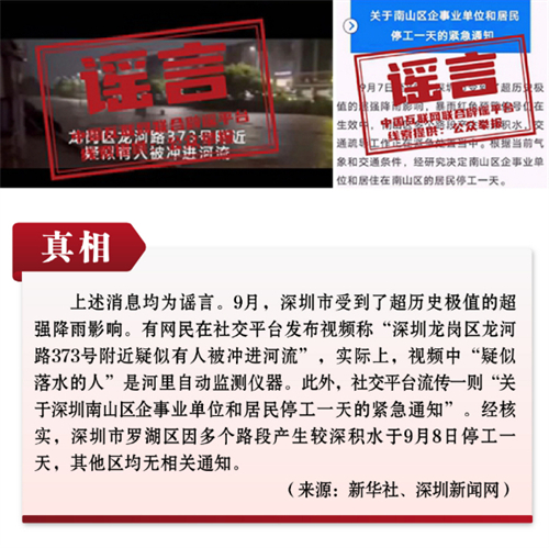 謠言6:深圳市超強降雨期間龍崗區(qū)龍河路有人被沖進河流?南山區(qū)停工一天?