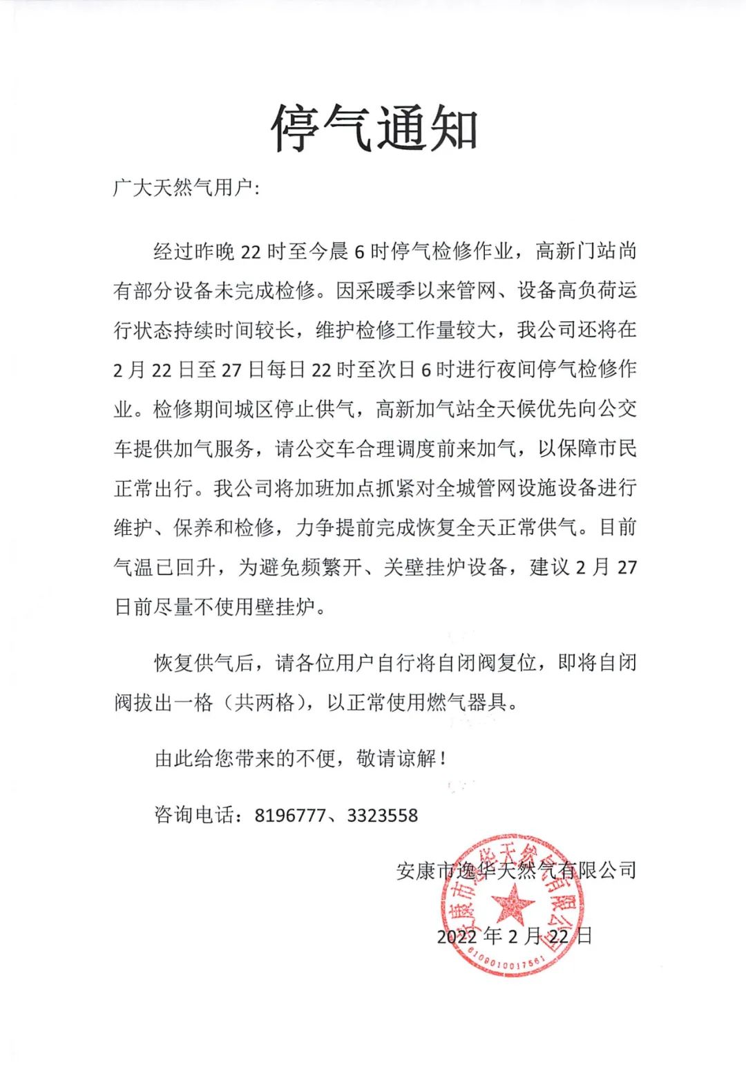 2月22日至27日每日22時至次日6時,城區停止供氣