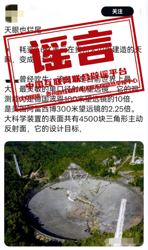 真相:近日,海外社交平臺有網民發布一張圖片,聲稱“耗資2.6億美元在貴州大山里建造的天眼,變成了垃圾場!”對此,“貴州辟謠”官方微信公眾號發布消息稱,網傳說法為謠傳,網傳圖片實為美國波多黎各的阿雷西博天文臺(Arecibo Observatory)于2020年12月發生徹底坍塌的畫面,該天文臺主要的觀測裝置為阿雷西博射電望遠鏡。事實上,這并非“中國天眼”第一次“被坍塌”,2020年阿雷西博望遠鏡第一次出現嚴重損壞之際,網絡中就曾出現過類似謠言。
