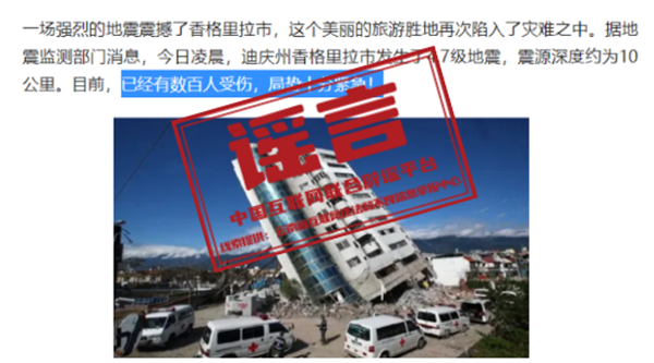 真相:2024年4月9日22時07分,云南省迪慶藏族自治州香格里拉市發生4.7級地震,有網民發布“大樓倒塌”畫面圖片,并稱“已經有數百人受傷”。對此,“迪慶發布”微信公眾號發文回應,目前,暫未收到人員傷亡報告,當地通訊、供電、交通正常。經核實,網傳“大樓倒塌”圖片也與此次地震并無關聯,系部分自媒體為博眼球、蹭流量,運用拼湊網絡舊圖、舊視頻等手段,發布香格里拉地震不實圖文、音視頻等信息嚴重誤導網民。(來源:云南互聯網聯合辟謠平臺、“迪慶發布”微信公眾號)igt安康新聞網