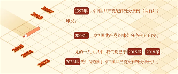 2023年12月,新修訂的《中國共產黨紀律處分條例》印發,共158條,牢牢把握黨的紀律建設的政治屬性和時代特征,在總則中增寫“堅持自我革命”、“為以中國式現代化全面推進強國建設、民族復興偉業提供堅強紀律保障”等內容,突出政治紀律和政治規矩,完善了紀律處分運用規則,加強了紀法銜接,充實了違紀情形,細化了處分規定。