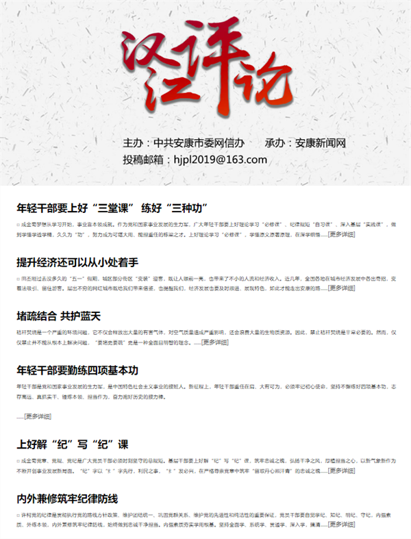 三是圍繞省委、市委“三個年”活動部署,網站開設“一把手開麥——聚焦‘三個年’”專欄,聚焦我市“高質量項目推進年、營商環境突破年、干部作風能力提升年”主題報道,為推進安康高質量項目發展、助力擦亮“營商環境最安康”金字招牌、提升全市干部作風能力,營造濃厚良好輿論氛圍。