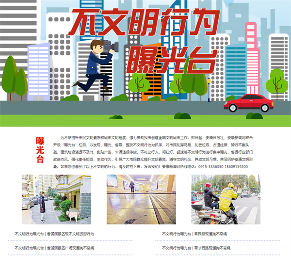 安康新聞網履行媒體輿論監督職能,聚焦民生熱點,開辦《不文明行為曝光臺》輿論監督專欄,集中曝光身邊的不文明現象、行為,引導市民群眾自覺規范文明行為,主動融入城市文明創建熱潮,為提升市民文明素質和城市文明程度貢獻媒體力量。同時,聚焦群眾關切,積極開展調查性報道,發布《〈安康市物業服務與管理條例〉關“我們”什么事?》等一批原創新聞,還原事件真相,及時宣講與群眾生活息息相關的最新政策條例,體現地方黨媒的責任與擔當。