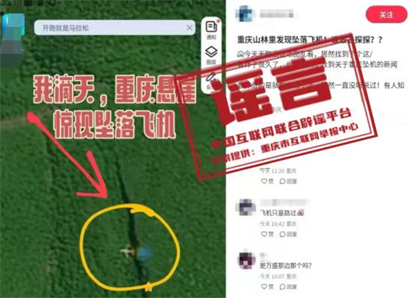 真相:近日,有網民在某網絡平臺發帖稱“重慶山林里發現墜落飛機”。帖中畫面顯示,一架飛機“躺”在森林中,并用紅色字體醒目標注“重慶懸崖驚現墜落飛機”。帖文稱“看樣子很久了,也沒在網上搜到關于重慶墜機的新聞。最神奇的是,就在主城不遠,居然一直沒有聽說過。”經核查,重慶無墜機事件發生,網傳信息系謠言。(來源:“重慶辟謠”微信公眾號)