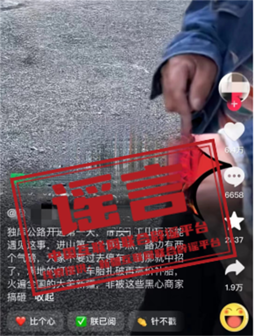 真相:據新疆文化和旅游廳官方微信公眾號消息,獨庫公路已于6月1日10時正式通車。近日,網傳一則“獨庫公路亂撒釘子,商家補胎賺錢”的視頻內容,引發網民關注。經新疆烏蘇市公安局調查核實,視頻反映的事發地處于獨庫公路K599路段,為保障通行安全,公路有關部門已對該路段進行巖壁防護網加固工作。視頻中現場釘子來源為施工方拆卸固定模具板材時散落的舊釘子,且根據現場排查,周邊并無汽車輪胎維修點位。視頻發布者的車胎并未被釘子扎破,亦不存在高額補胎的情況。(來源:“新疆網絡辟謠”微信公眾號)