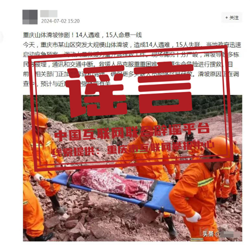 真相:7月2日,某網(wǎng)民發(fā)布信息稱,“重慶市某山區(qū)突發(fā)大規(guī)模山體滑坡,造成14人遇難,15人失聯(lián)。”經(jīng)相關(guān)部門核實,重慶近日未發(fā)生相關(guān)地質(zhì)災(zāi)害,網(wǎng)傳信息系謠言。(來源:重慶辟謠)