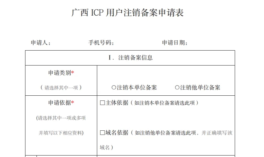 備案注銷需要到備案號當?shù)氐耐ㄐ殴芾砭窒螺d“注銷備案申請表”,按“填表須知”中的要求把申請表里的信息填好,將材料郵寄或送到指定地點即可。處理結果申請人可自行登錄工信部備案系統(tǒng)“公共查詢”可查詢。以廣西為例: