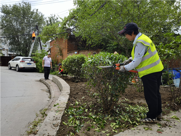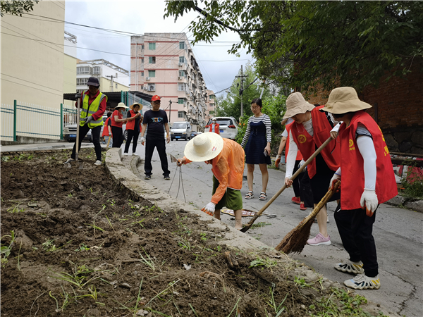 7月23日,前張嶺社區志愿者和高新綠化工人聯手整治群眾占用的街心花園。(陳小勇)