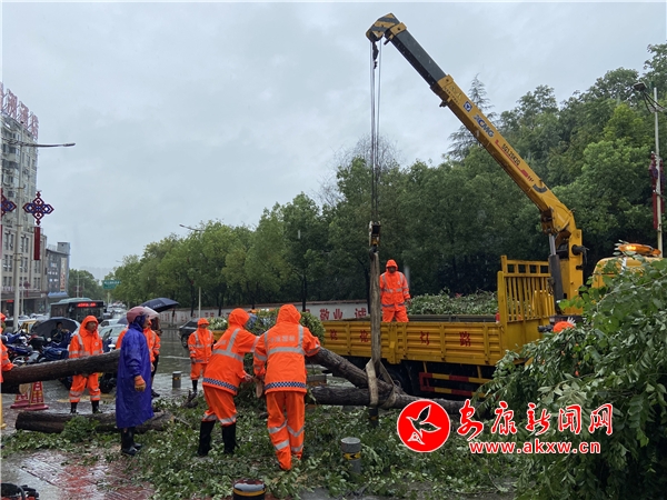 7月22日上午,位于黃溝路金城美墅小區門口,一棵碗口粗的大樹連根撥起,擋住了過往的車輛和行人,市政部門工作人員冒著大雨,正在清理。 (王國秀)