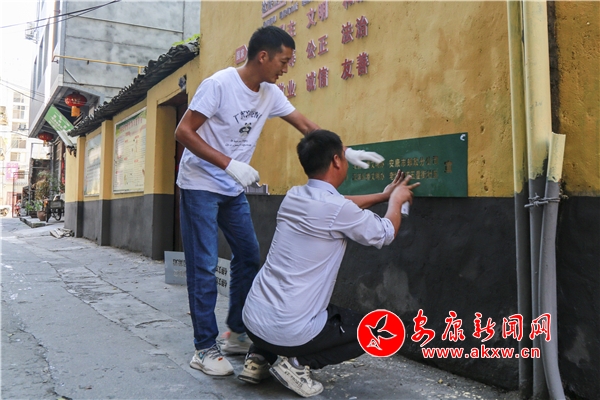 7月21日, 城區五星街社區組織人員,對五星街的背街小巷進行清理,粉刷墻面,書寫標語。(李春江)