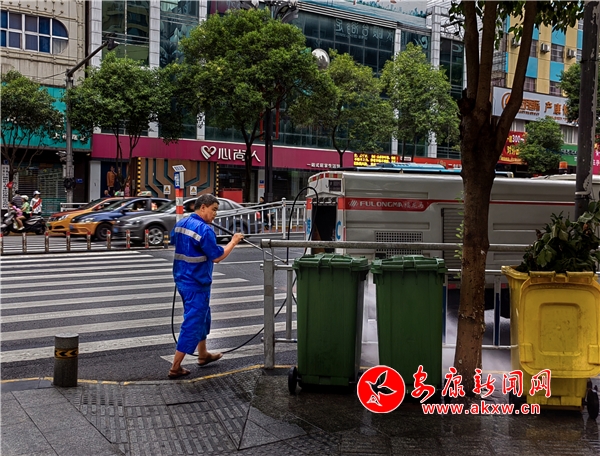 7月18日,環衛工人正在清洗垃圾桶、人行道。(袁滿)
