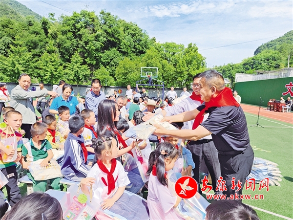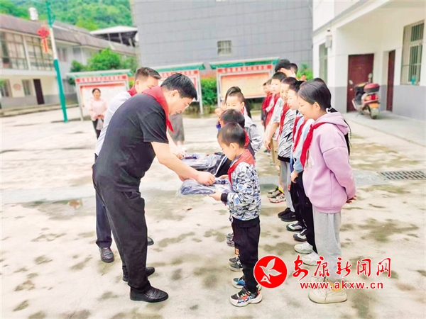 平利縣審計局聯合興隆鎮蒙溪街小學開展“六一”送關愛活動,為蒙溪街小學全體學生送去夏秋季校服。彭書梅 攝