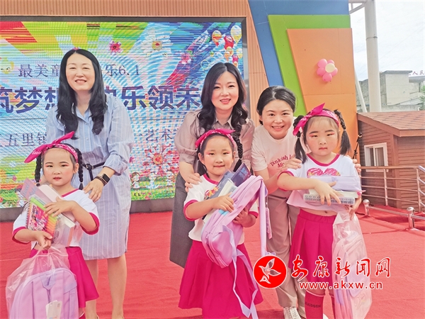 漢濱區稅務局為五里鎮幼兒園的小朋友送去書包等文具慰問品。陳榮斌 攝