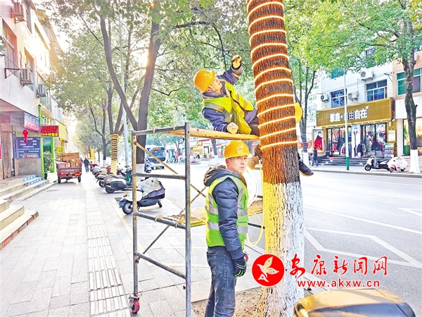石泉縣為營造絢麗多彩的城市夜景,在向陽大道兩旁的景觀樹上安裝LED燈帶。楊勇 攝 Su2安康新聞網