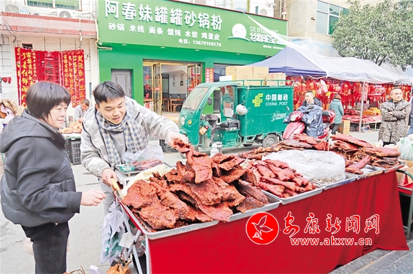 在嵐皋縣城興隆街、建設路農貿市場,臘肉、香腸、臘排骨、臘豬蹄、血豆腐等等紛紛亮相,為市民提供了豐富的年貨。廖霖 攝Su2安康新聞網