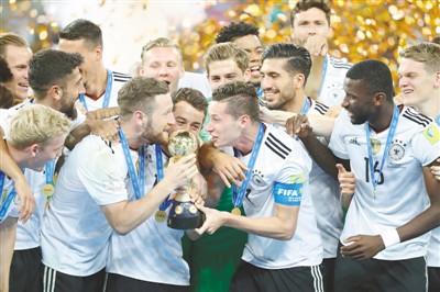 | 7月2日,俄羅斯圣彼得堡舉行的2017年聯合會杯足球賽決賽中,德國隊以1∶0戰勝智利隊,奪得冠軍。德國隊球員在頒獎儀式上捧杯慶祝。 |