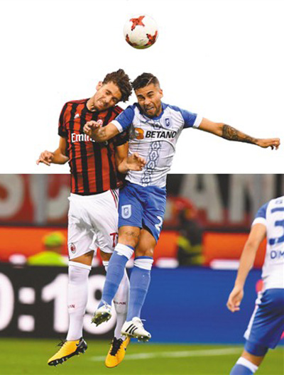 | 8月3日,在意大利米蘭進行的歐聯杯資格賽第三輪次回合比賽中,意甲AC米蘭隊主場以2∶0戰勝羅馬尼亞克拉約瓦大學隊。圖為兩隊球員在拼搶。 |