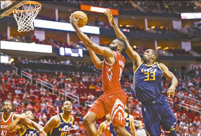 當地時間11月5日,火箭隊球員哈登(上左)在比賽中突破上籃。當日,在2017—2018賽季美國男籃職業聯賽(NBA)常規賽中,休斯敦火箭隊主場以137∶110戰勝猶他爵士隊,收獲三連勝,哈登全場25投19中,罰球12罰11中,拿下56分13次助攻,創造個人得分新高,56分也是火箭隊歷史上的第二高分;效力于火箭隊的中國球員周琦連續第三場比賽替補上場,貢獻4分和1個籃板。Nm5安康新聞網