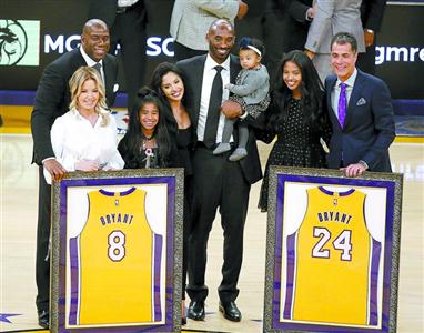 當視頻畫面播放至最后一幀,科比從那條熟悉的球員通道走向球場中央。在全場球迷山呼海嘯的“MVP”呼喊聲中,“魔術師”約翰遜和球隊老板珍妮·巴斯代表球隊向這位湖人英雄致敬,“我們有幸同時退役你的兩件球衣,不會再有下一個科比了。兩件球衣所代表的成就,都足以進入籃球名人堂,湖人不會再有人能夠穿8號和24號球衣,我們將在這里將這兩件戰袍退役。”