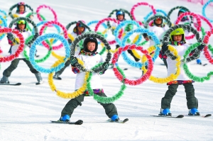 1月21日,“2018世界雪日暨國際兒童滑雪節”活動拉開帷幕。圖為在北京延慶舉行的開幕活動上,幾十位小朋友手持奧運五環標志在滑雪教練帶領下滑雪。 新華社記者 鞠煥宗攝