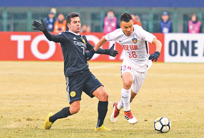 | 1月30日,天津權(quán)健隊(duì)球員孫可(右)與對(duì)手在比賽中拼搶。 |